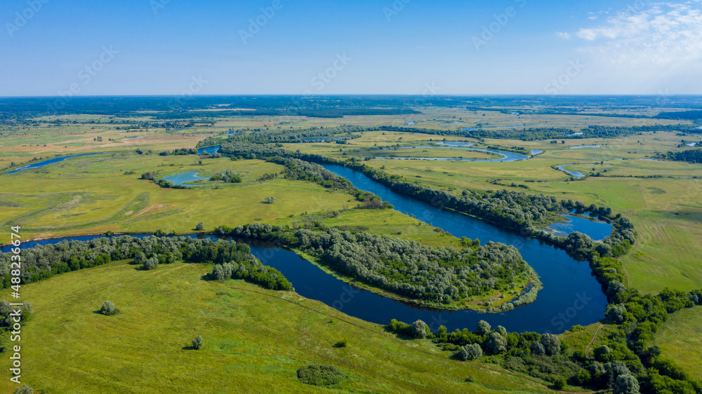 Aerial view of a beautiful summer landscape over river. Wide green valley with a river running in the middle. Green meadows. Top view over beauty nature.