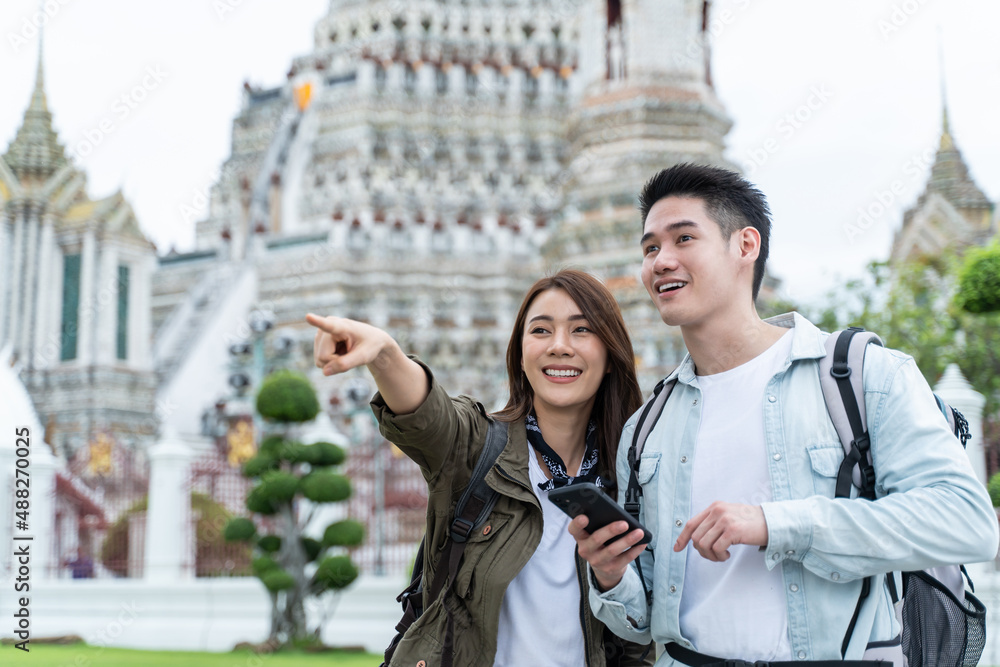 Asian attractive romantic couple travel in the city for honeymoon trip.