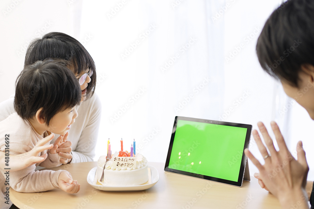 モニター越しに誕生日をお祝いするアジア人の家族
