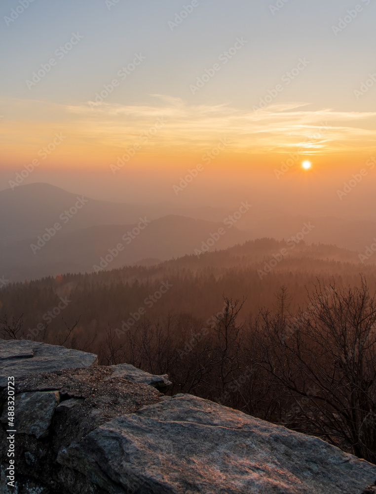 peaks of lusatian mountains in Czech Republic during foggy sunset in winter as seen from mount Hochwald in Germany