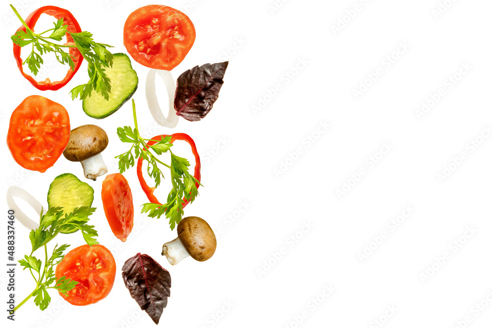 Light spring summer salad with flying floating in air ingredients, fresh vitamin vegetables. Suspended tomato, cucumber, pepper, parsley, basil. Vegetarian vegan healthy food menu
