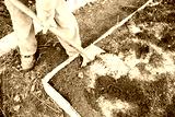 Male gardener worker digging in vegetable garden with shovel. Farmer man in rubber boots working hands with spade dig black soil, ground, lawn.farmland, agriculture. Autumn fall spring work cleaning
