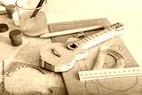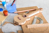 Handmade cardboard guitar and stationery supplies on table