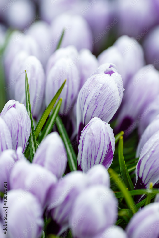 Purple spring crocuses in the garden. Bulbous blooms in spring.