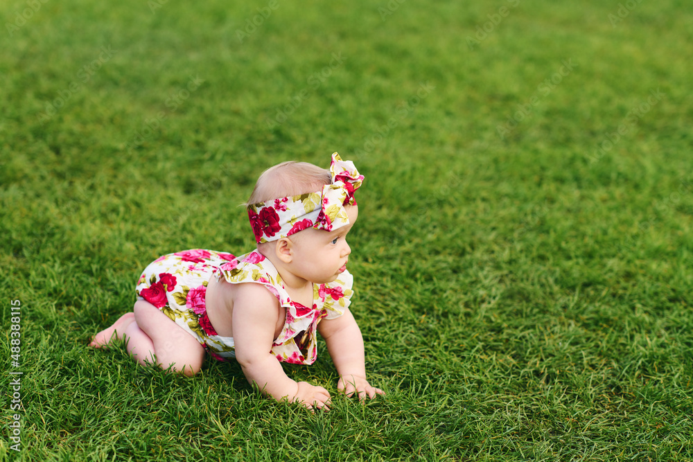 Outdoor portrait of adorable 6 months old baby girl playing in summer park, child crawling on fresh green lawn