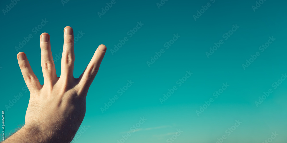 Male hand showing or doing number four gesture on blue summer sky background. Man gesturing number 4 in sign language. Counting down, four fingers up concept idea. Rabia sign. Copy space for text.