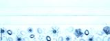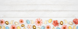 Easter bottom border with eggs, paper flowers and wooden bunnies. Top view against a white wood banner background. Copy space.