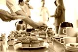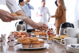 Woman taking snack during coffee break, closeup