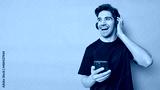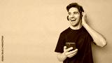 Horizontal shot of happy adult man dressed in casual black t shirt listens music via headphones enjoys favorite audio track isolated over yellow background blank copy space for your promotion