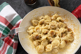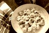 delicious golden fried ravioli in a frying pan on the table. Fried dumplings for dinner
