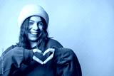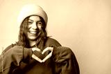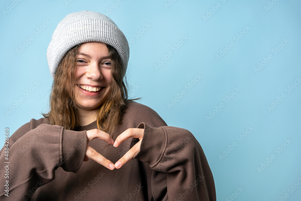 A cute European teenage girl in fashionable knitted hat folded her heart out of her fingers and smiles