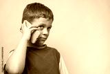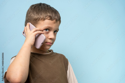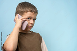 naughty caucasian boy talking on the phone . A charming child with a phone