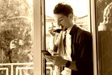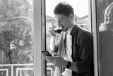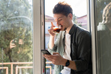 One young caucasian man having cup of coffee while standing by the window at home in sunny day wearing shirt browsing internet on mobile phone sending text messages in morning real people copy space