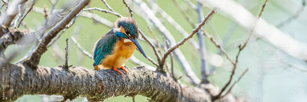 Banner image of male common Kingfisher looking for fish from the tree branch.