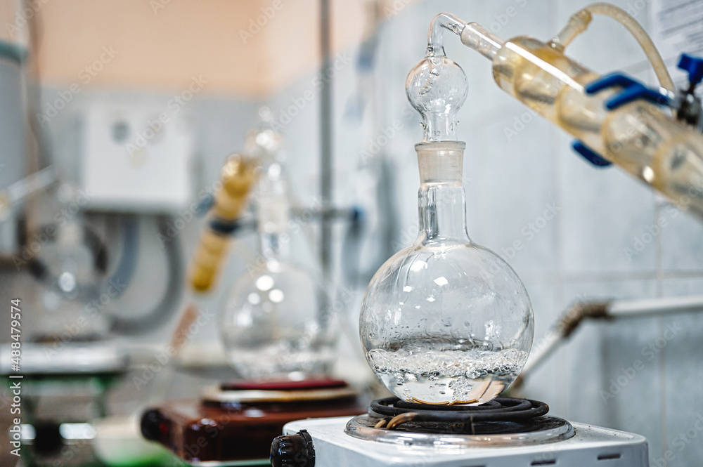 Flask with boiling alcohol at distillation in laboratory