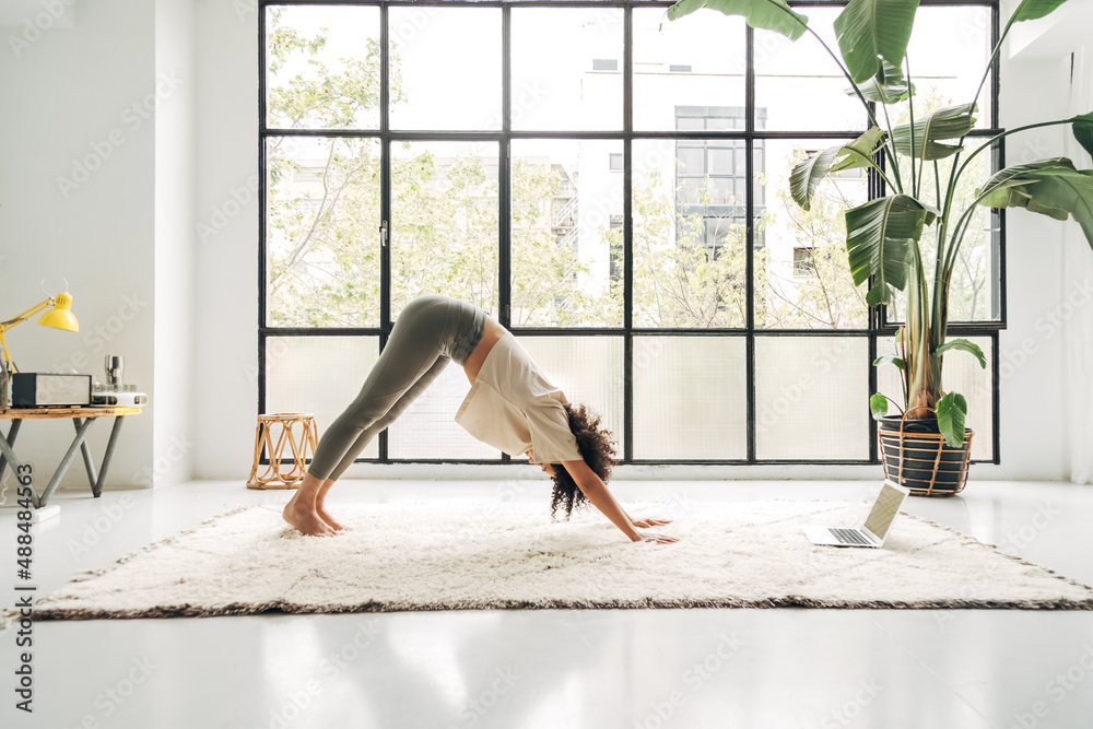 Young multiracial woman doing downward facing dog yoga pose at home watching online class using laptop. Copy space.
