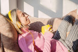 Smiling adult woman with closed eyes in headphones