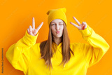 Young teen girl wearing yellow hoodie and hat, Hipster