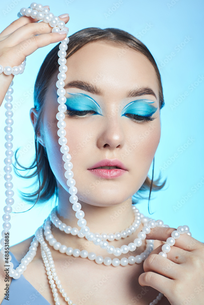 Portrait woman with bright colored eyes, all shades of purple blue. Short Hair, beautiful lips and makeup. Blue shadow eyelids. Sexy girl with short hair. Professional makeup