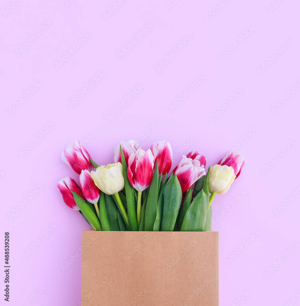 bouquet of colorful tulips in a paper bag on a pink background with space for text