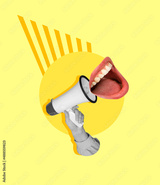 Human hand with megaphone and female open mouth on yellow background. Contemporary art collage. Inspiration, idea, trendy urban magazine style.