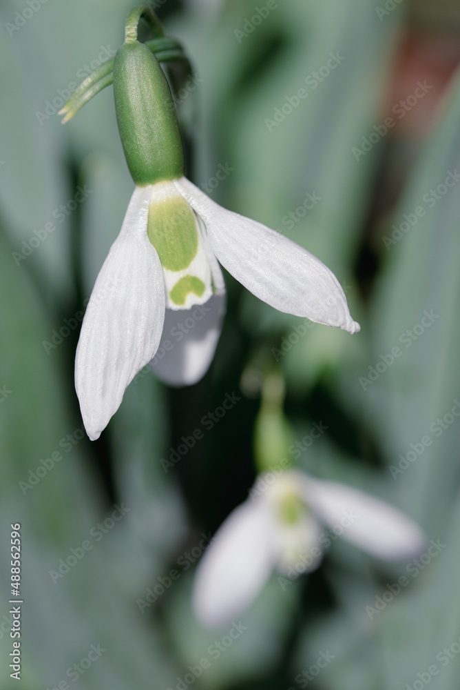 white snowdrops in spring, portrait format, in front of green leaves in nature