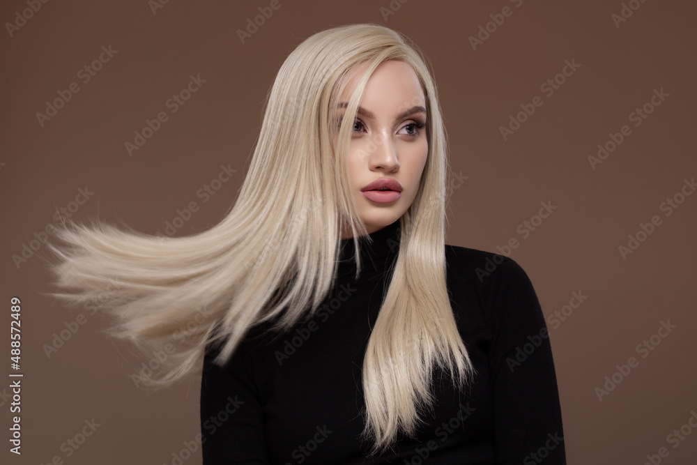 Portrait of a beautiful girl with long airy hair. Brown background.