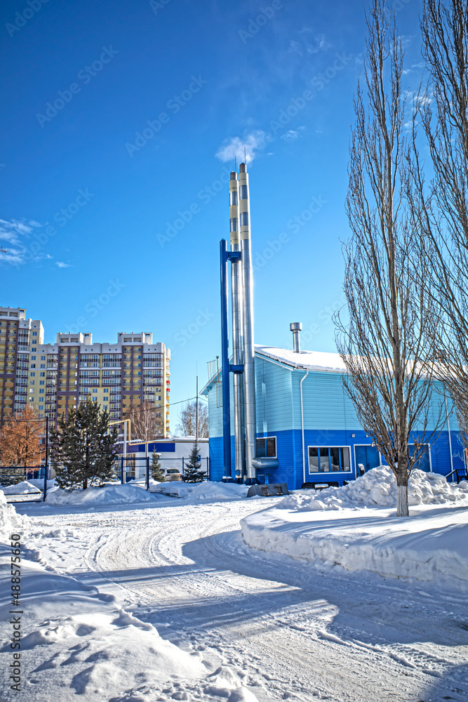 Quarterly gas boiler house on a sunny winter day