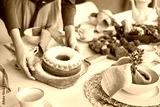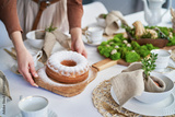 Hands of unrecognizable woman setting table with an easter cake