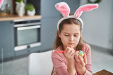 Focused caucasian girl decorating easter eggs in the domestic kitchen