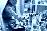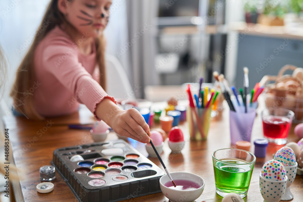 Caucasian girl decorating easter eggs in the domestic kitchen
