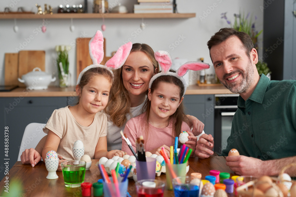 Portrait of playful caucasian family sitting over tabled full of easter eggs