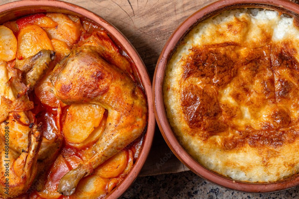 Egyptian Food, Rice with Milk, Potato and Chicken in Oven on Wood and Marble Background