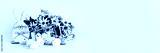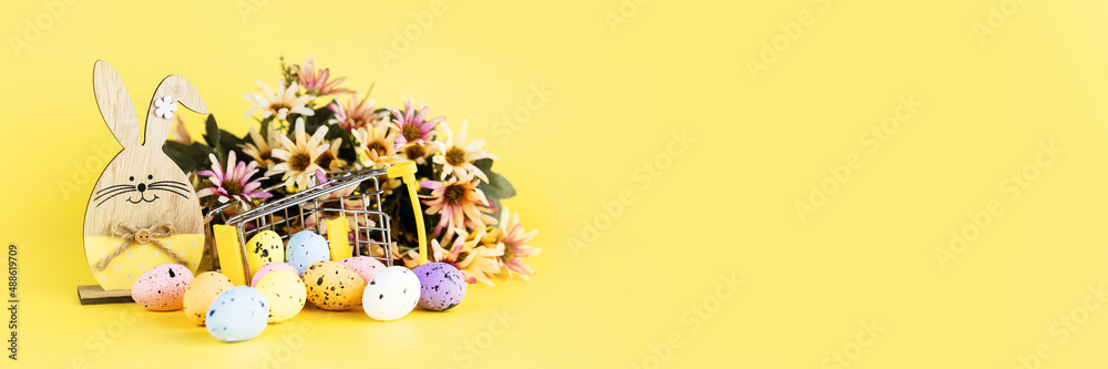 Colorful easter quail eggs in shopping cart, wooden bunny and spring chrysanthemum flowers on yellow background. Copy space. Minimal Easter concept. Banner