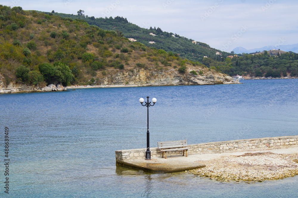 View of a lantern and bench on the seashore. Corfu. Greece.