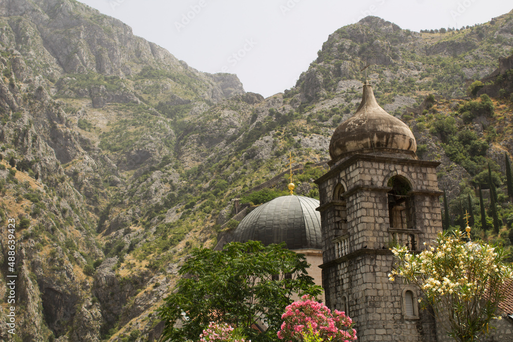 View of the old church and mountains on a summer day. Kotor. Montenegro.