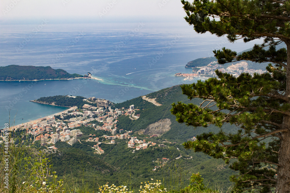 Panoramic view of the city, sea and bay on the sunny day. Top view. Budva. Montenegro.