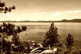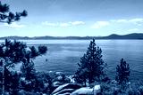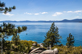 View of smooth rocks on shore of Lake Tahoe and beautiful view across the water with kayak rowing and mountains in the distance