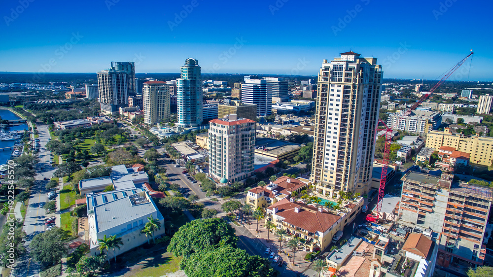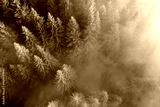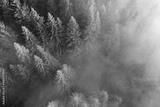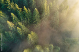 Aerial view of brightly illuminated with sunlight beams foggy dark forest with pine trees at autumn sunrise. Amazing wild woodland at misty dawn. Environment and nature protection concept