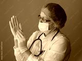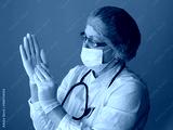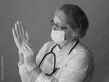 Photo of an elderly woman doctor wearing a mask in uniform putting on gloves against a gray background. Profession saving lives. Help of older doctors during the coronavirus pandemic.