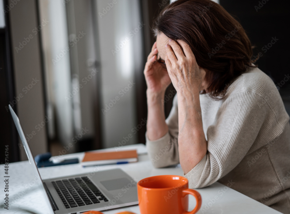 Tired old senior business woman taking off glasses suffers from eyestrain, stress, headache, fatigue after computer use work at home