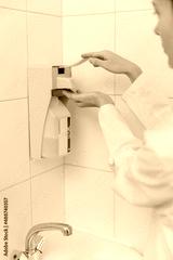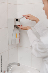 The doctor in white uniform disinfects his hands. Surgeon washing hands hospital concept. The nurse washes her hands with sanitizer or dispenser or alcohol solution for hand disinfection, close-up.