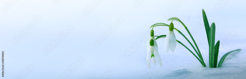 First spring white snowdrops flowers in the snow.