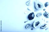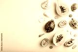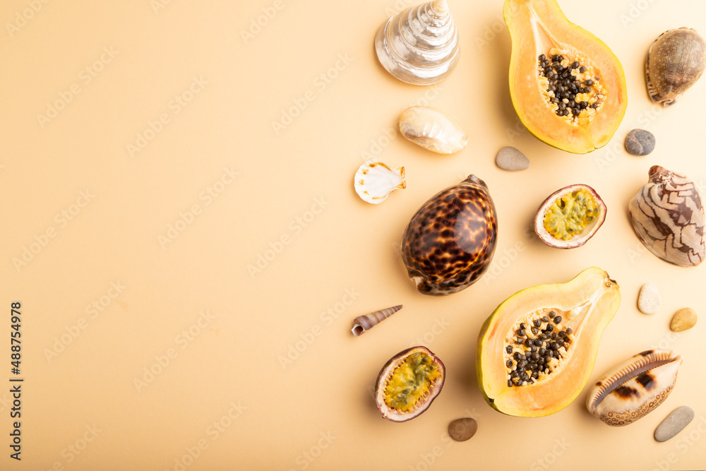 Ripe cut papaya, passion fruit, seashells, pebbles on orange pastel background. Top view, copy space.