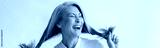 Joyful Asian lady in blouse holds long hoary hair laughing on light grey background in studio. Mature beauty lifestyle