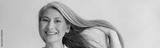 Happy middle aged Asian lady shows natural silver hair posing on light background in studio. Mature beauty lifestyle