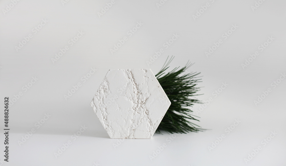 Empty texture stone platform eco podium on white copy space background. Minimal still life display product presentation scene.