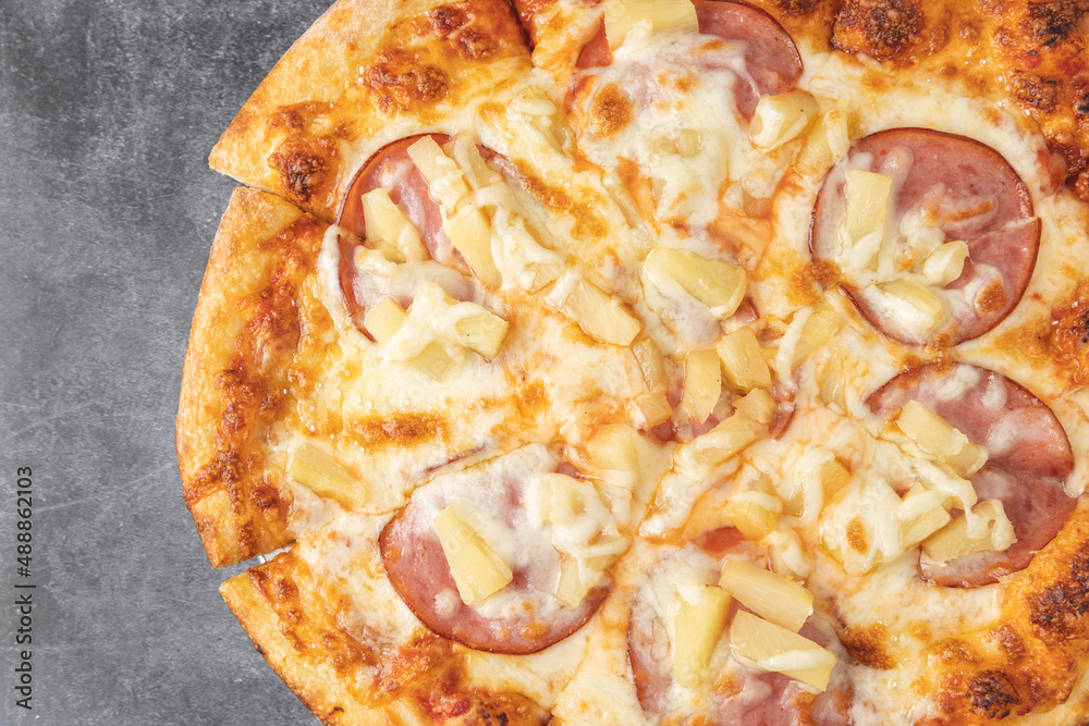 Close up overhead shot of a fresh baked Hawaiian style ham and pineapple pizza on a pizza platter indoors on a gray table.