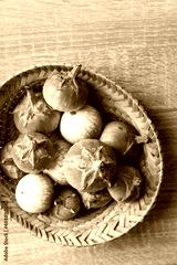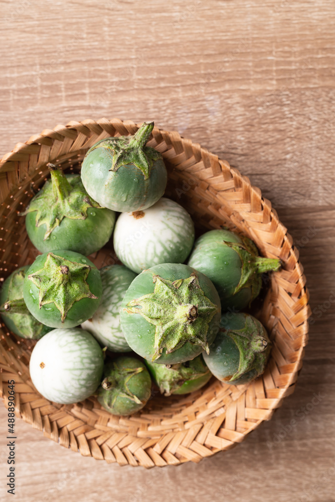 Organic Thai eggplant in basket on wooden background, Food ingredients in Thai cuisine, Vegetables from local farmer market