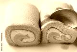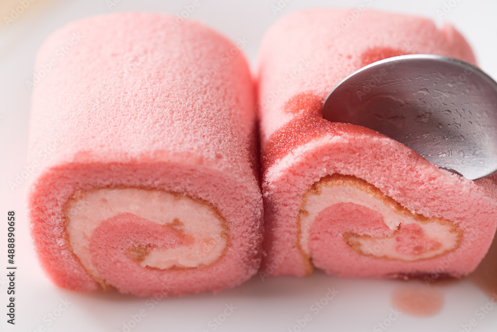 Pink strawberry roll cake or swiss roll with whipped cream and strawberry flavor eating by spoon